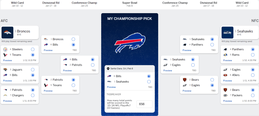Unreasonable reasoning: The Seahawks had the better record, have the better overall team, and should win the Super Bowl. The Bills have Josh Allen and the NFL gods owe Buffalo a win.