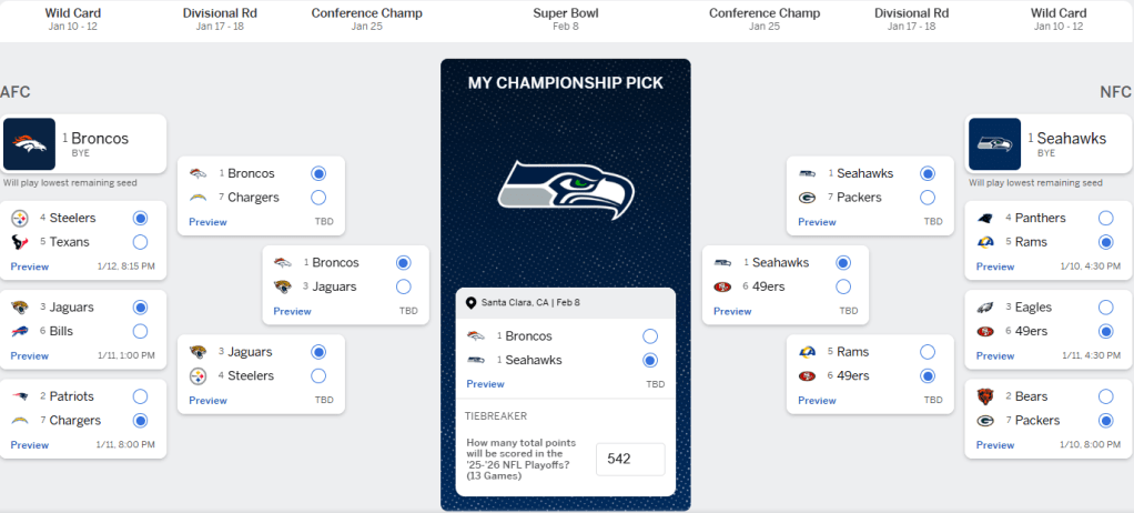 That all being stated. Let’s get to my totally going by my gut picks for the NFL Playoffs. I’m throwing out all the nerd stats, all the “rules” to live by, and just going by “I’ve got a feeling about this” and here’s why.